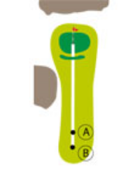 (A) A short uphill par three. The green is guarded by two bunkers in front. A steep drop into a water hazard awaits those who overshoot the green.
